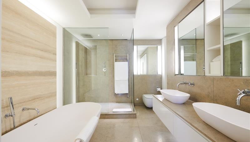 The apartment further comprises a guest shower room, two bedrooms (one with an ensuite) with sliding doors patio doors onto the private terrace, master suite with a dressing room and ensuite bathroom presenting impeccable bespoke marble with a freestanding bath and walk-in shower, a private 16 meter decked terrace.