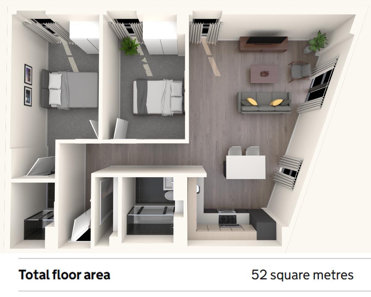 This apartment comprises a bright open plan kitchen and living room, two double bedrooms with wardrobes(master with ensuite), a moden family sized bathroom and ample storage.